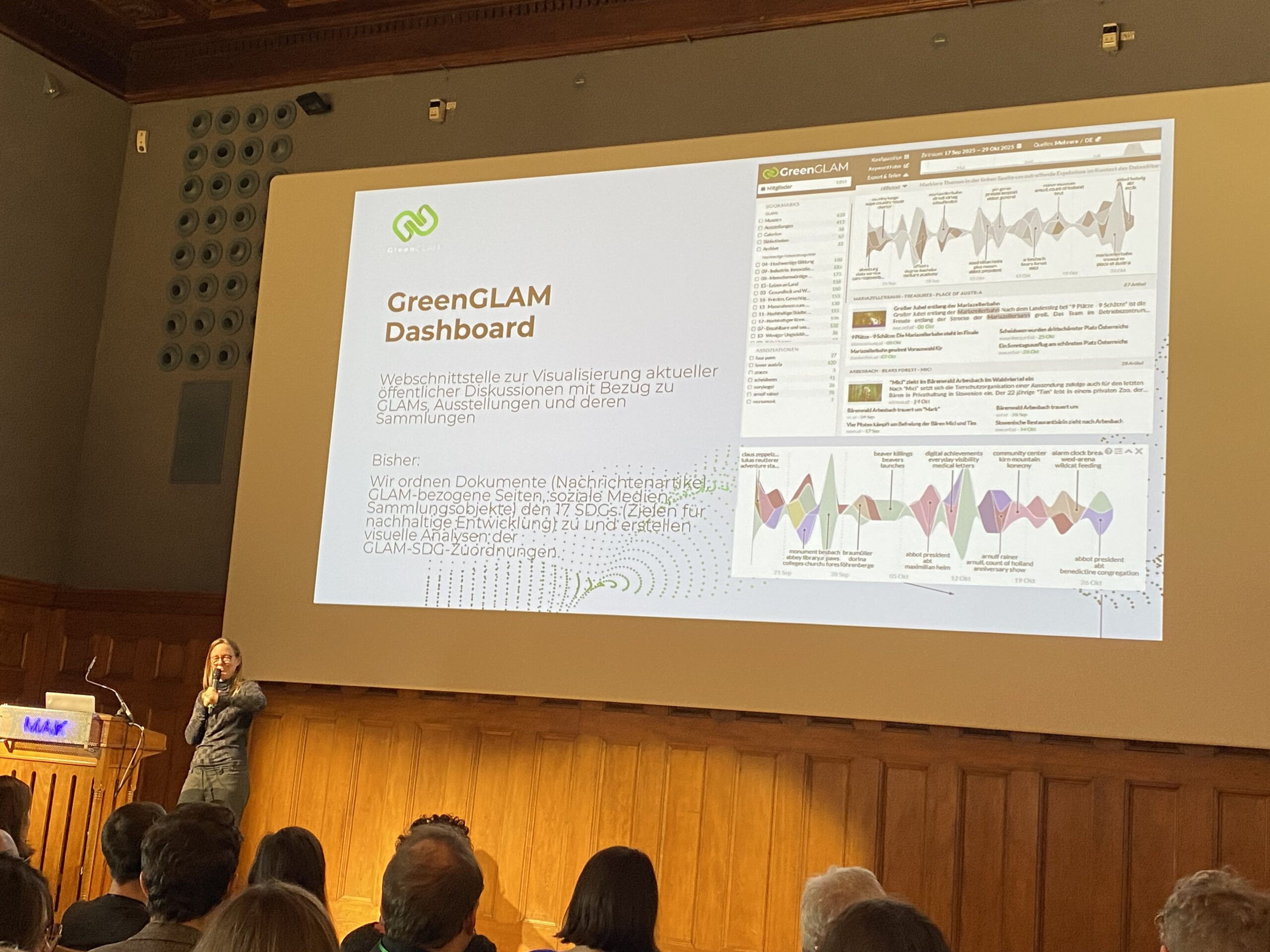 Die Präsentation, gehalten von Sylvia Petrovic-Majer (OpenGLAM.at) und unterstützt von Lyndon Nixon (Modul Technology), konzentrierte sich darauf, die Projektvision und -ziele zu erläutern. Dabei wurde aufgezeigt, wie kulturelle Institutionen ihren Beitrag zu den Sustainable Development Goals (SDGs) sichtbar und greifbar machen können. Da sich GreenGLAM derzeit auf halbem Weg der Entwicklung befindet, bot die Veranstaltung eine wichtige Gelegenheit, Feedback zu sammeln und Einblicke von Stakeholdern zu gewinnen, um unsere Methodik noch besser an die Bedürfnisse und Ambitionen kultureller Institutionen auszurichten.